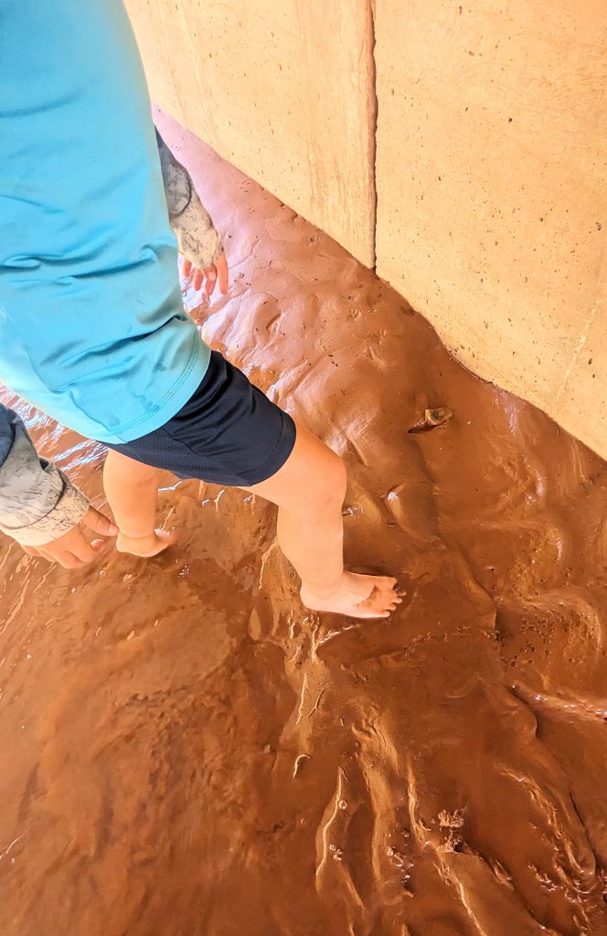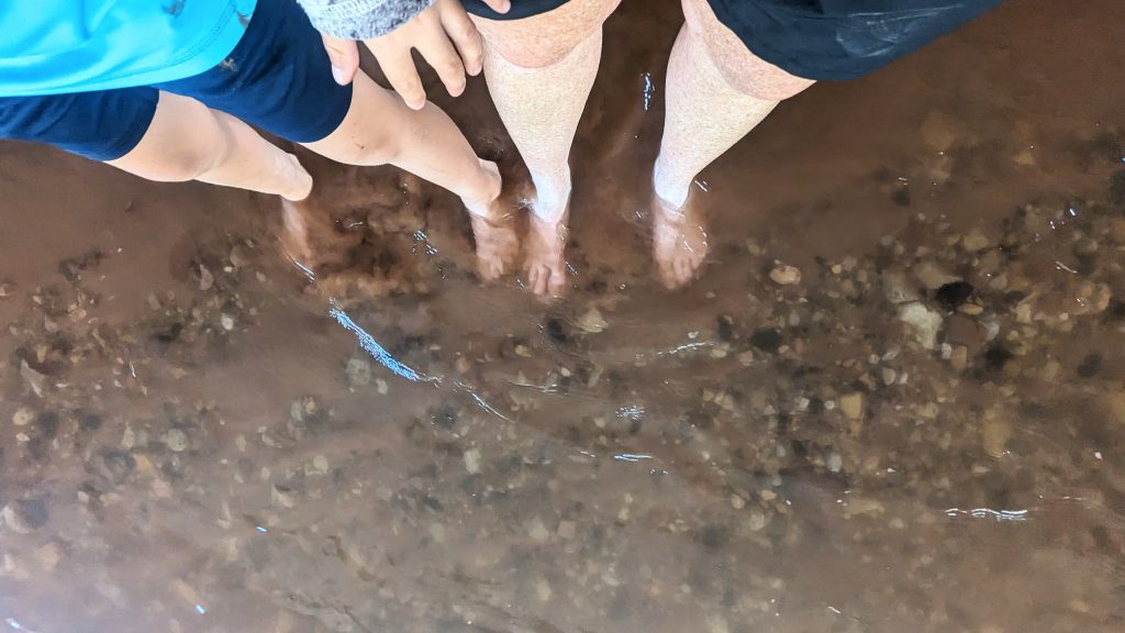 Malachi and I decided to dip our feet on the cold water. There was think mud… And it was ducky to get our shoes back on ๐. But it was refreshing.