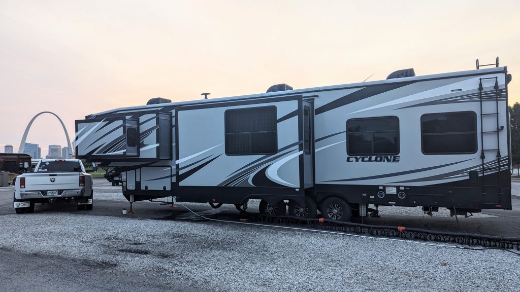 We picked this site because it was close to the arch and Sean could visit with us a little easier. The RV park was actually right over the border in East St Louis, Illinois. It had a beautiful view of the arch, but it was really just a full hook up in a parking lot. It brought back memories of when we stayed in NJ for NYC…