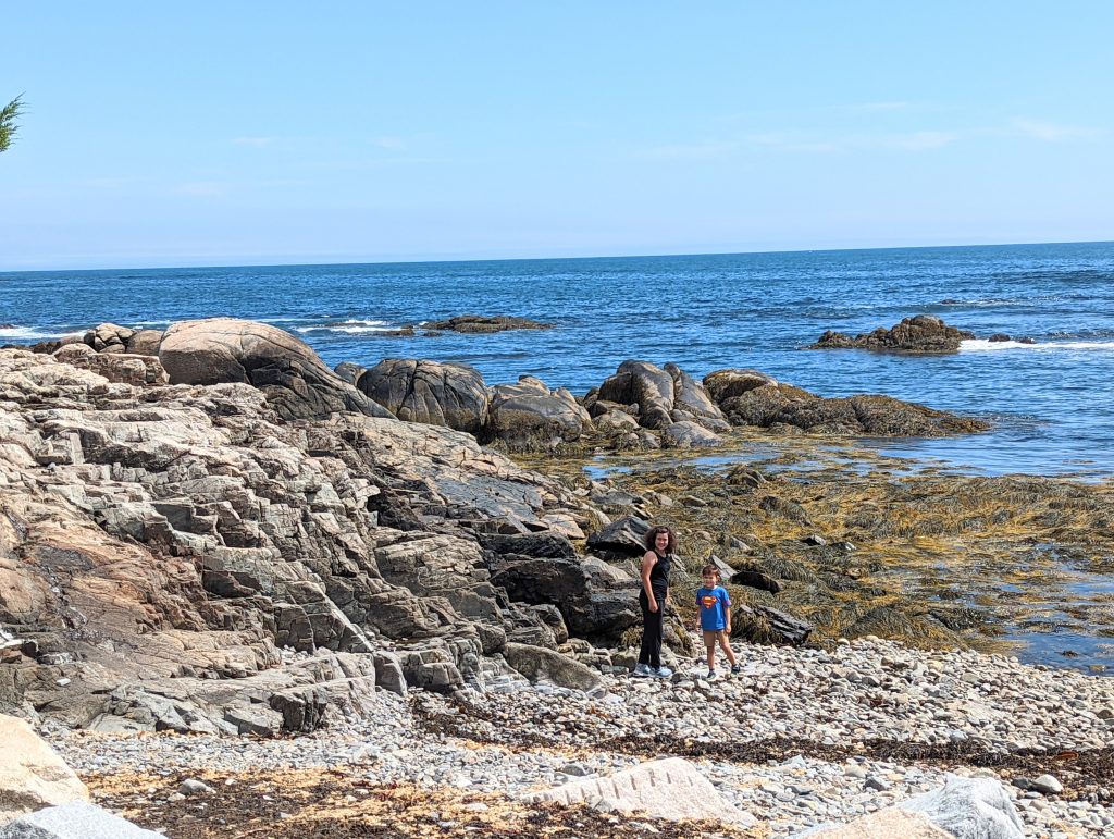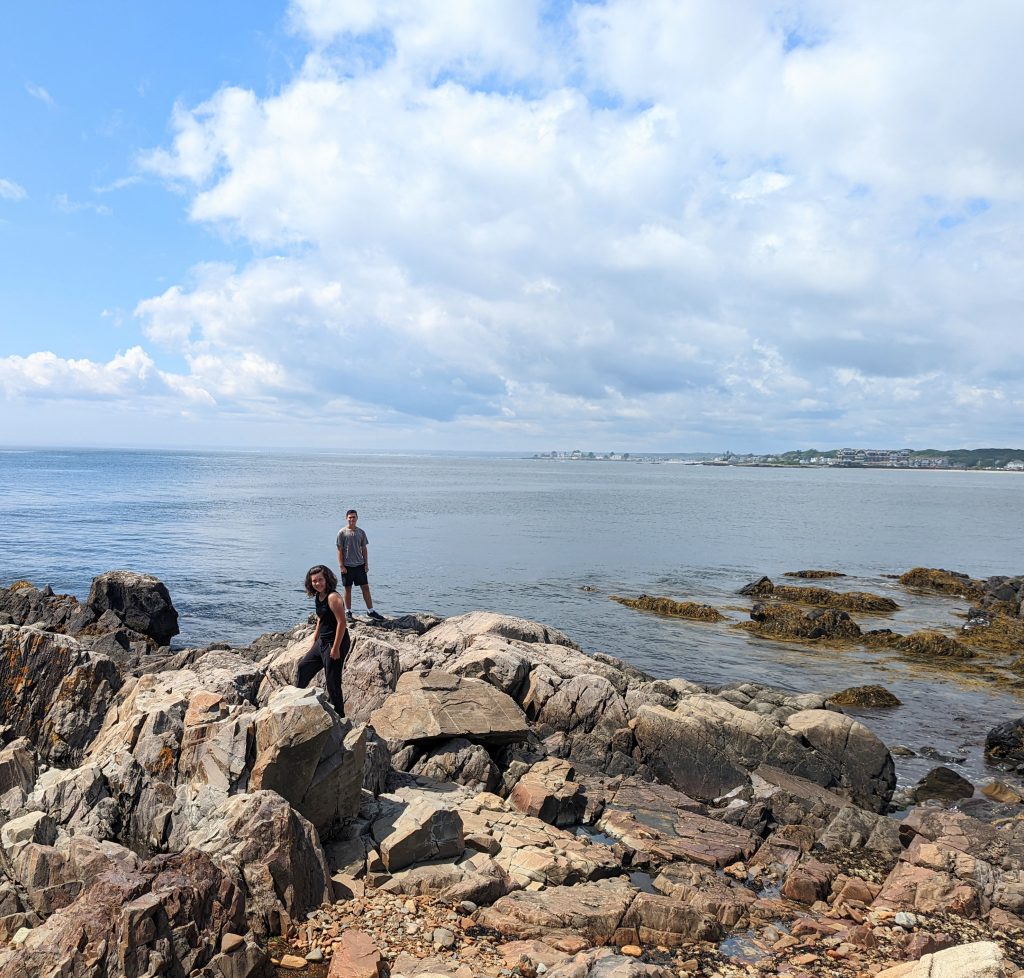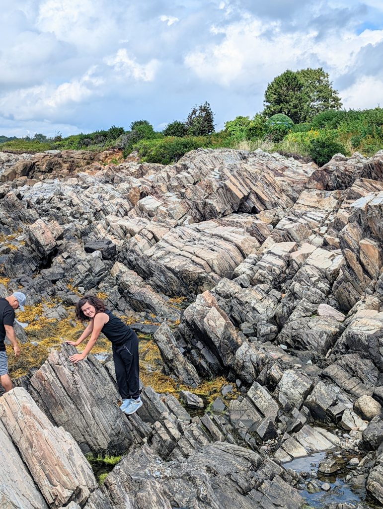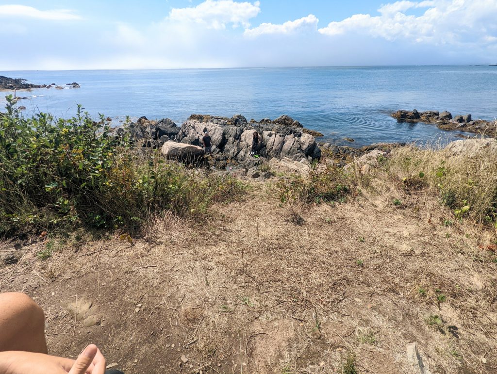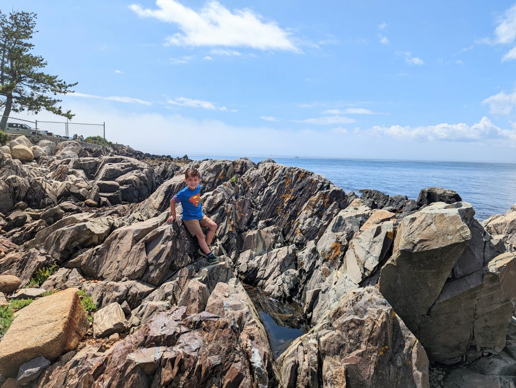We went down Ocean Avenue. We found some rocks to climb to take in the view. Sean found some clams in the cleft of the rocks.