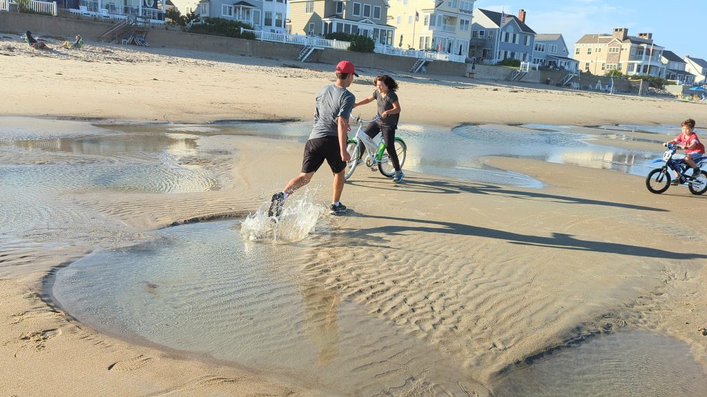 I don’t have any pictures of the campground but here is the beach we biked to from the campground. And….. The Maine welcome center sign.
