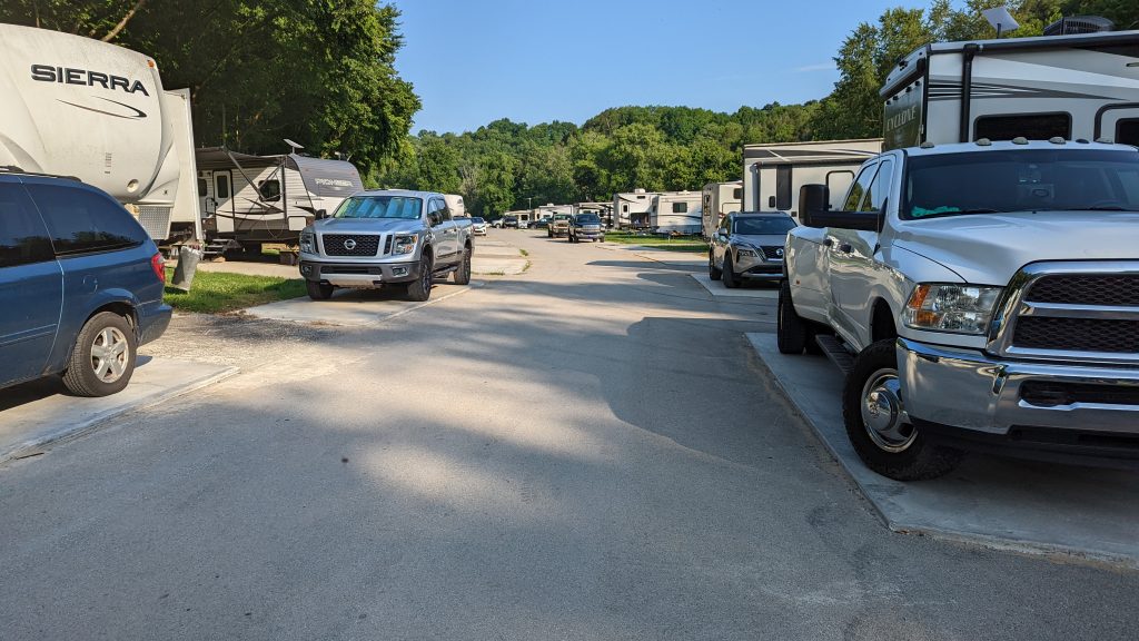The day just gets better. We pulled into Cummins Ferry RV park and it was pretty small routes and tight. I had to make a pass through our site bc I didn’t think I’d make the turn into our site. One of the park staff stepped in to help guide us and was adamant I follow his guidance, as we were heading toward the site he said he could get people to move their vehicles to make room. The staff guy didn’t and guided me to the turns to our site, unfortunately the tail swing of Ark I caught the front end of the across the site neighbor’s car. Lesson learned to follow your gut. Ark I has a minor damage on her right corner. FYI not quite big rig friendly as advertised.