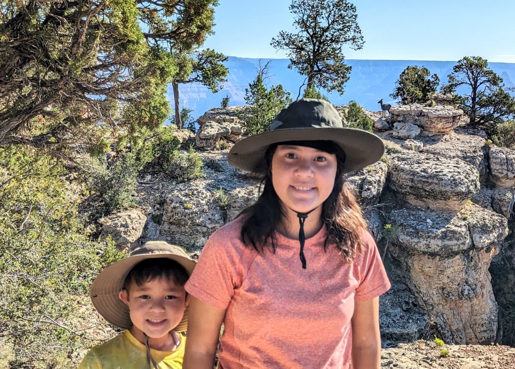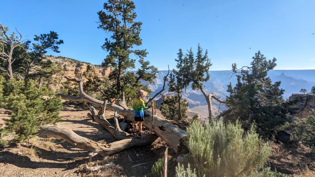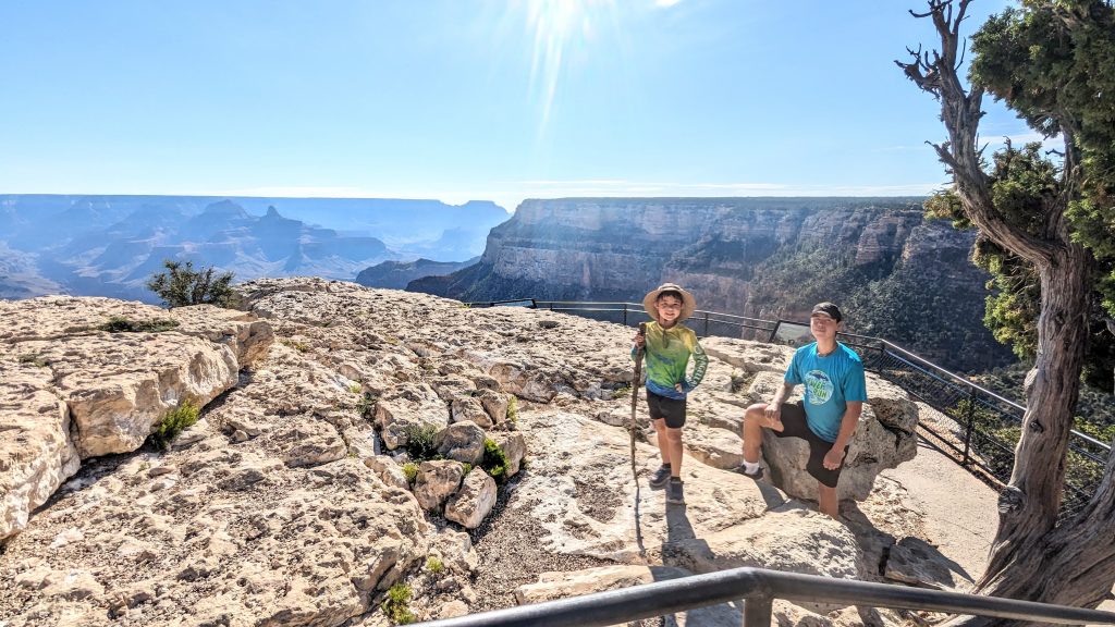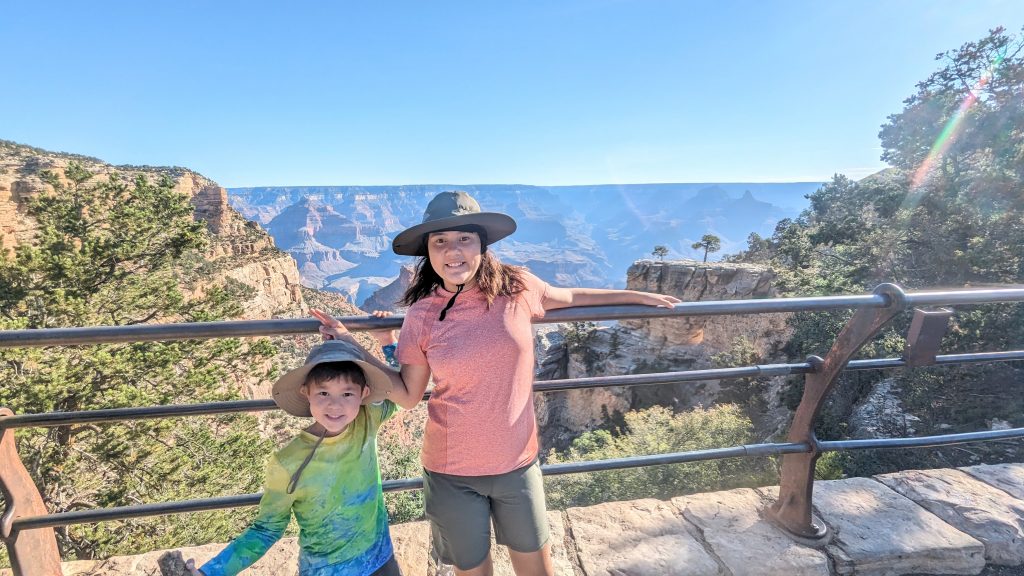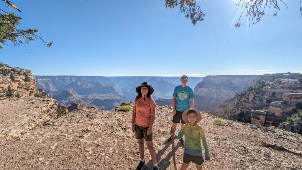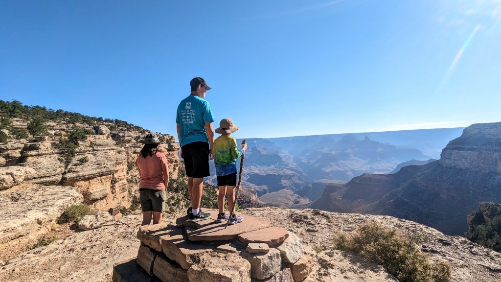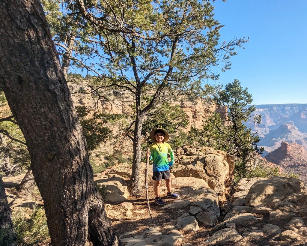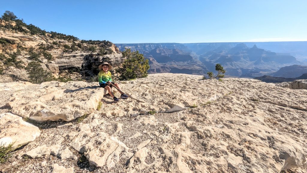 The kids and I did a portion of the trail along the Rim. We had the music blasting from the backpack and saw some amazing views. The combined walk was about 2.4 miles. Really, the limit is 2 miles if I want to keep everyone happy. ๐. The recommendation is to be off of the trails by 10am because of the heat. We started out early, and it was pretty manageable. It definitely feels better than our time in Arizona two weeks ago.