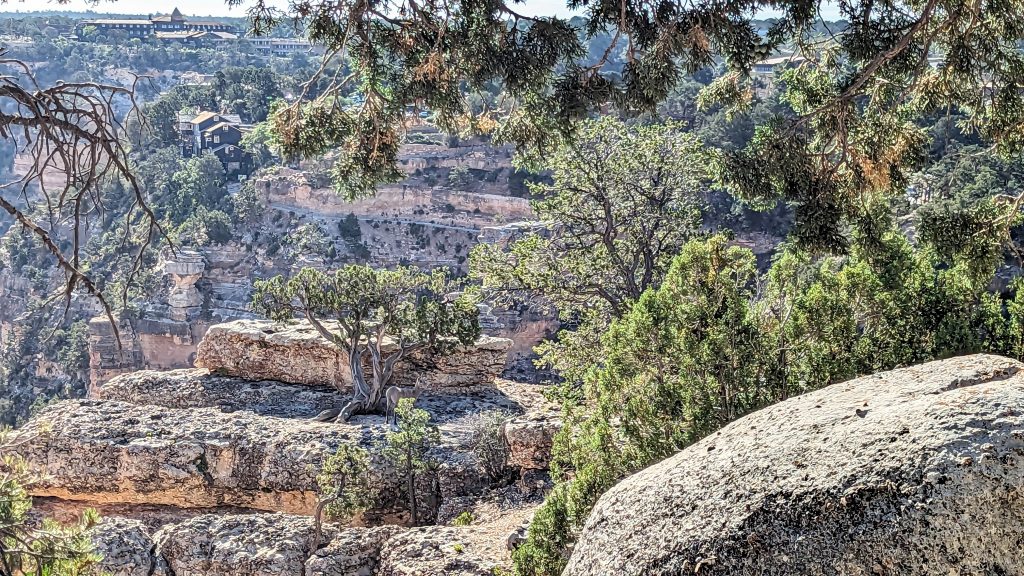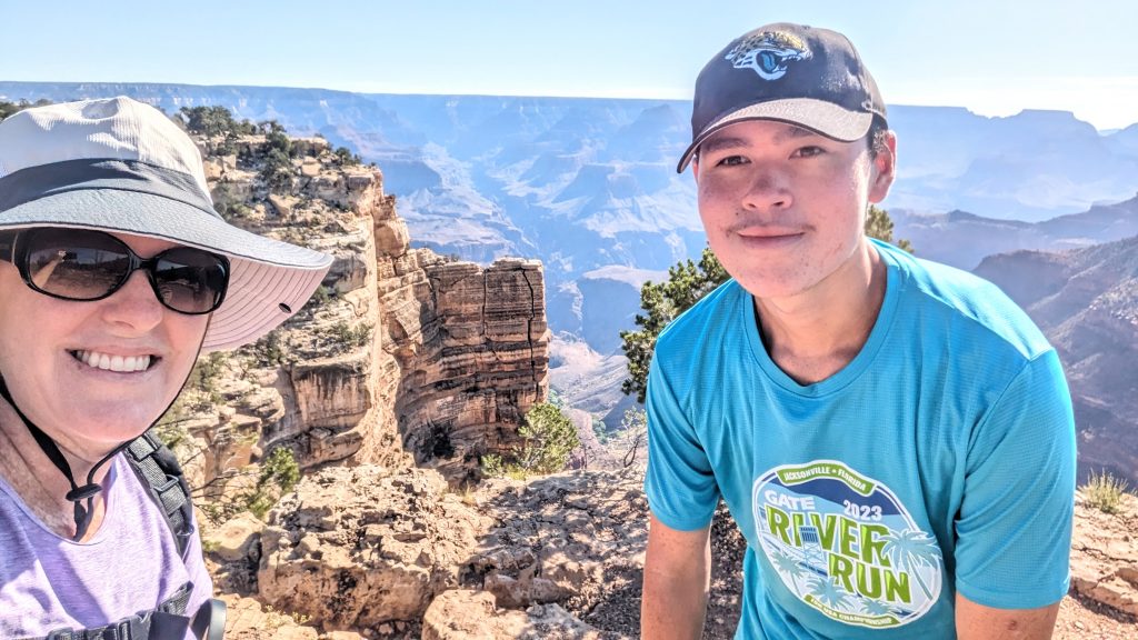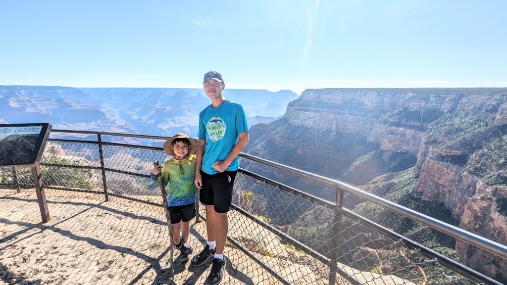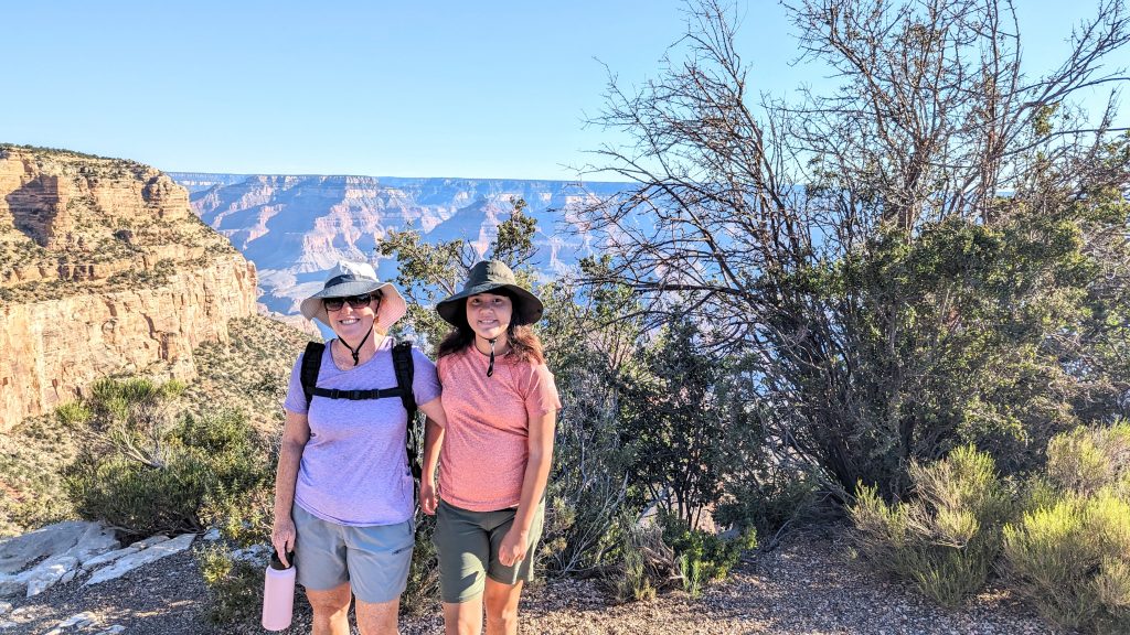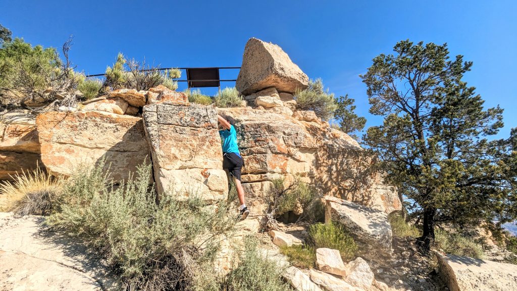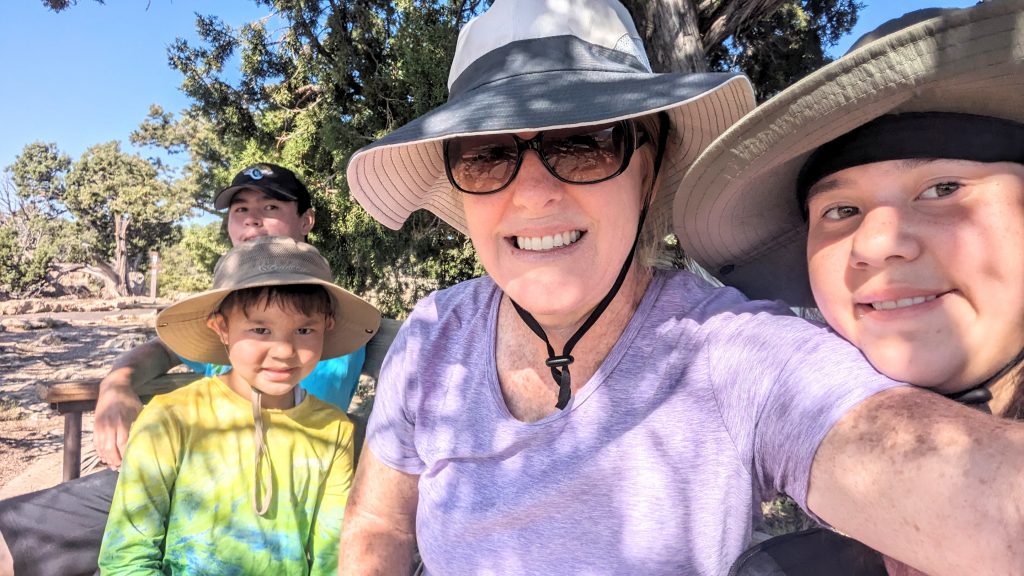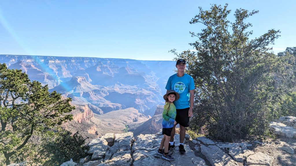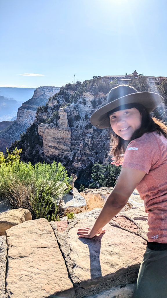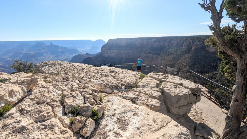 The kids and I did a portion of the trail along the Rim. We had the music blasting from the backpack and saw some amazing views. The combined walk was about 2.4 miles. Really, the limit is 2 miles if I want to keep everyone happy. ๐. The recommendation is to be off of the trails by 10am because of the heat. We started out early, and it was pretty manageable. It definitely feels better than our time in Arizona two weeks ago.