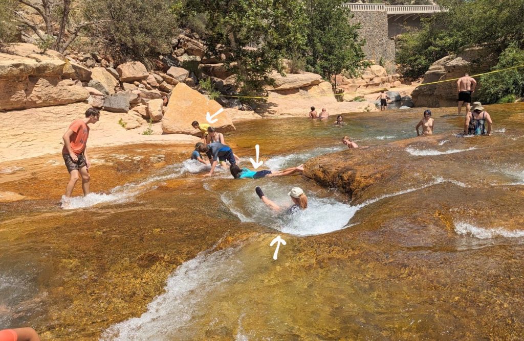 Information: Situated below an apple orchard and surrounded by the red rocks of Sedona’s Oak Creek, Slide Rock is 80 feet long and 2.5 to 4 feet wide, with a seven percent decline from top to bottom. Algae on the rocks creates the slippery ride.Slide Rock includes a 1/2 mile of Oak Creek that is open for swimming, wading and sliding. The world-famous slide that our park is named for is an 80 foot-long slippery chute that is worn into sandstone. The slide is known to induce smiles and laughter while creating lifetime memories so plan a trip and enjoy this Arizona wonder at the bottom of Oak Creek Canyon!