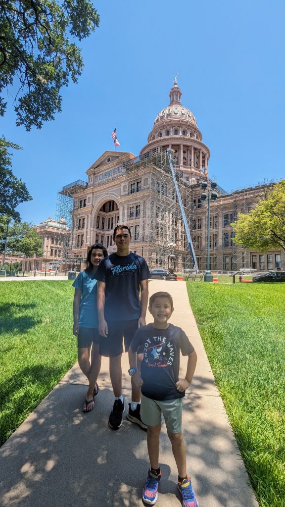 We had a fun (and very hot) day visiting Austin, Texas. I let the kids sleep in until almost 9, which gave us a later start. We didn’t get back home until after 9:00pm.