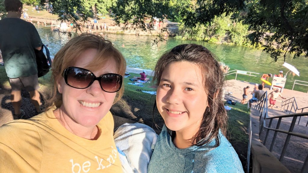 We enjoyed a great snow cone before heading to the Barton Springs swimming pool. Information: the pool itself measures three acres in size, and is fed from underground springs with an average temperature of 68-70 degrees. It connects with the Colorado River. By the way, that is colder than the usual Florida springs. ๐ณ