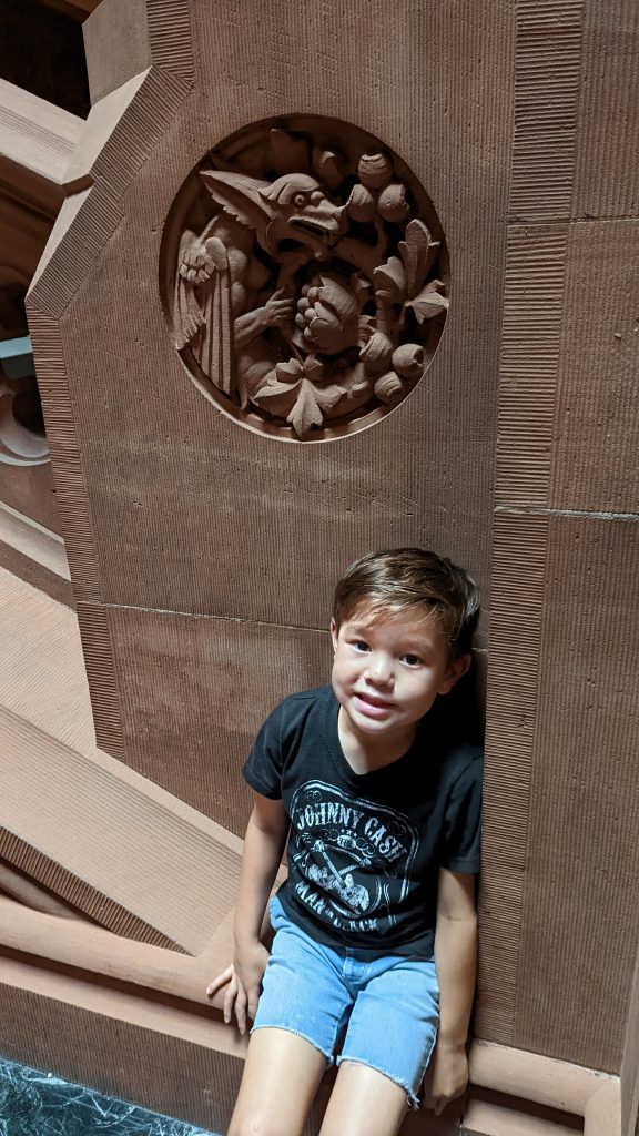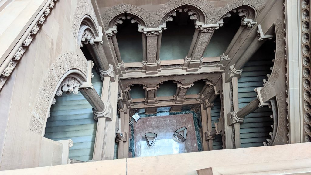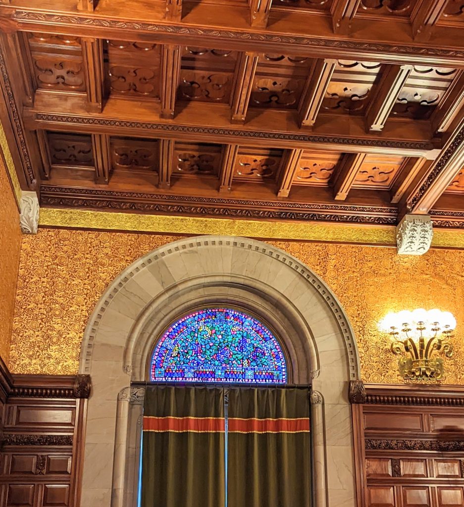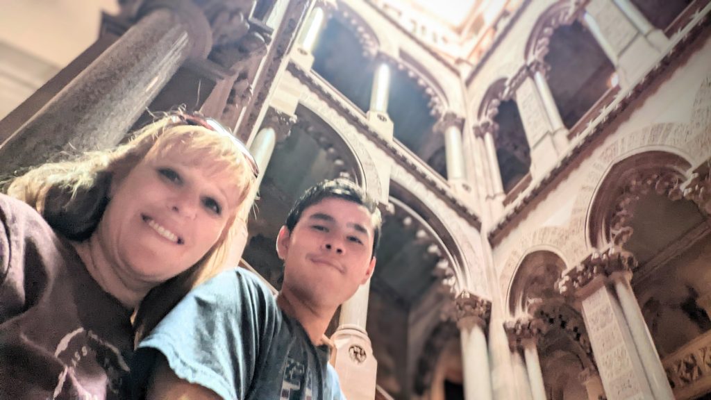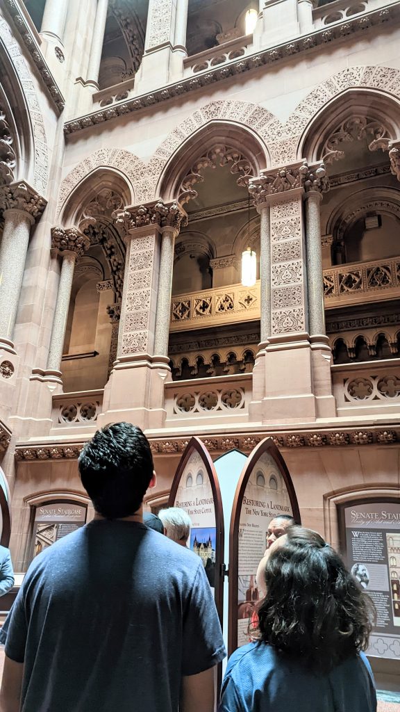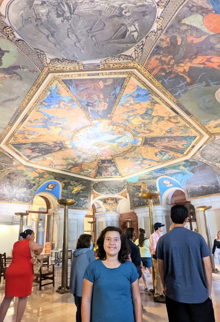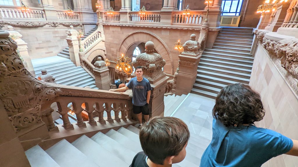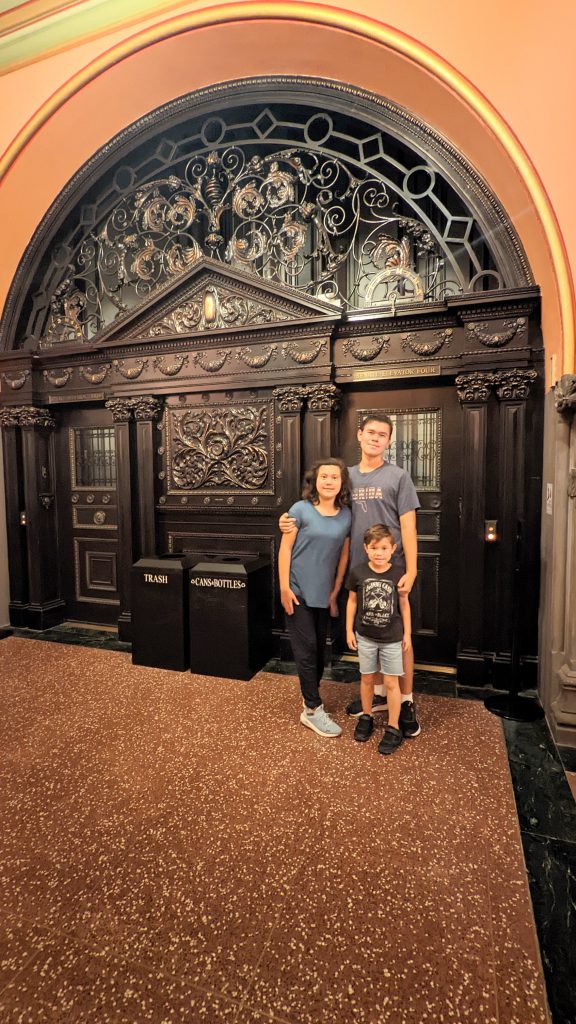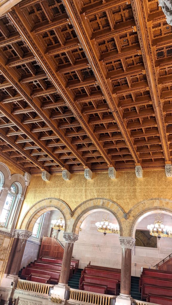 We visited the State House and Senate rooms. The walls are 14 carat gold-leaf in some places. There is a million dollar staircase in the middle with ornate carvings. The ceilings and walls were hand designed by various artists. There building is very ornate!