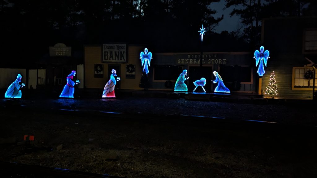 The train ride is a sing along. In the middle, the stop and talk about the Greatest Gift given. That was a welcomed story.