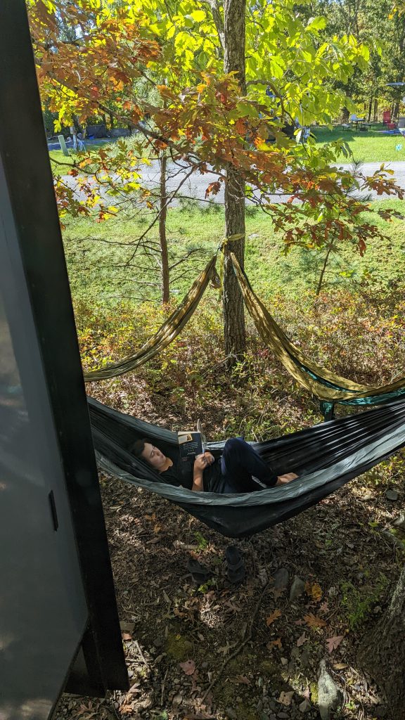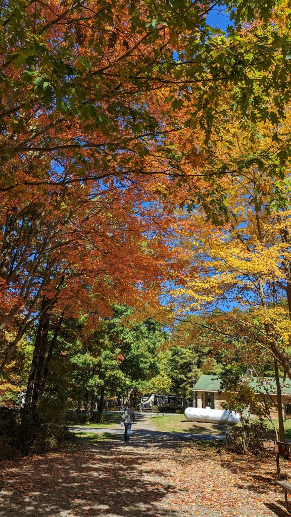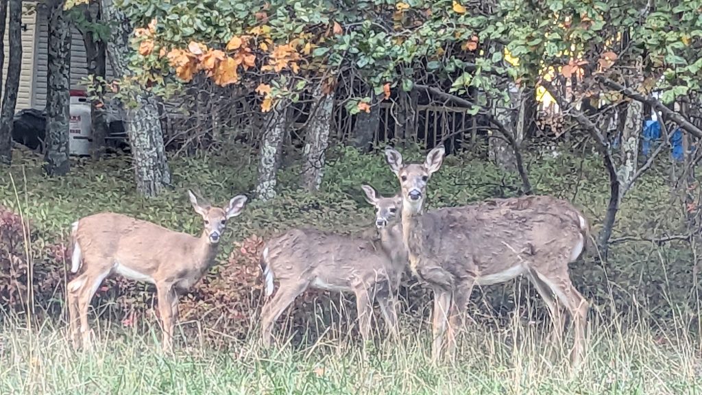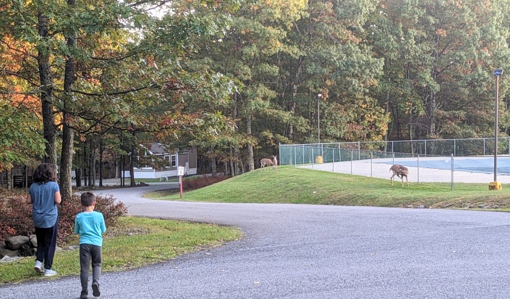 We are nestled in the Poconos Mountains. The sites are plentiful in space. We were able to pick our own site. The Internet is tricky, even with Starlink. But, it’s beautiful here. We have been following three deer in different areas in and around the RV park.