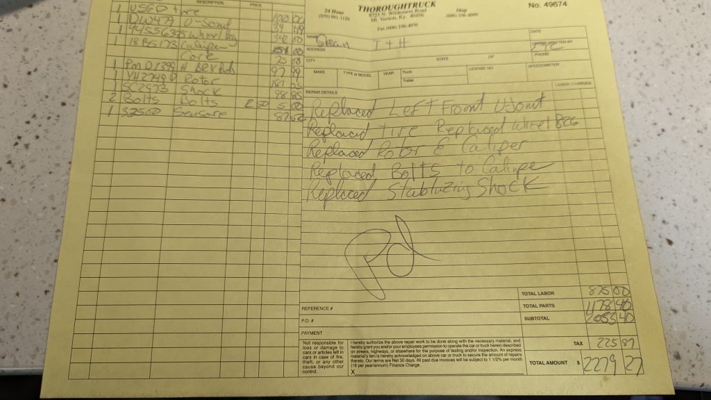 We are heading to Kentucky. 55 miles til our destination we had a roadside issue with the truck. A good Samaritan in Kentucky flagged us down and saw our tire was about to fall off. I ended up using a fire extinguisher to put out a fire inside the tire rim. Then there was a few other people who stopped to see if we needed help as we waited for towing.