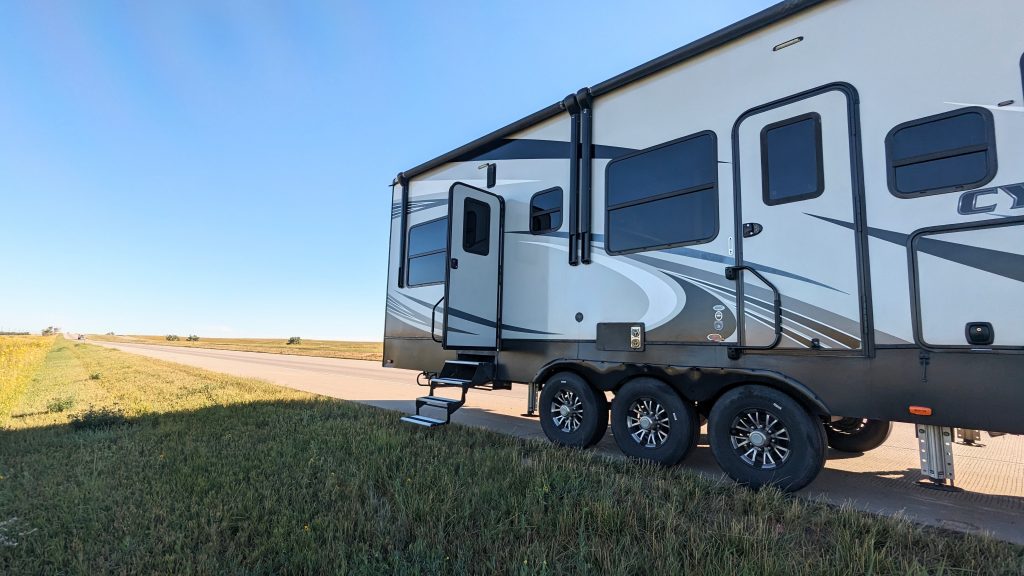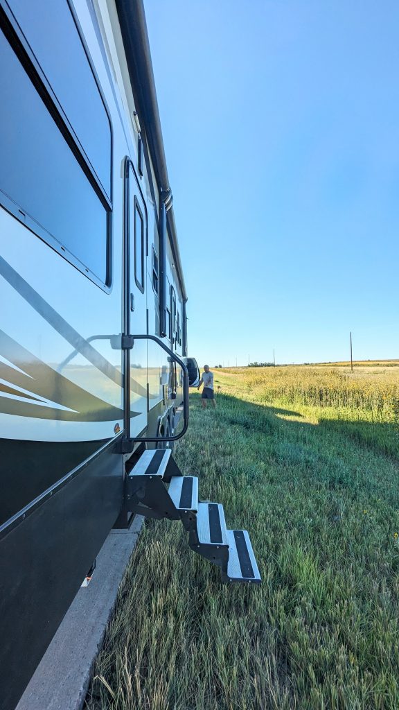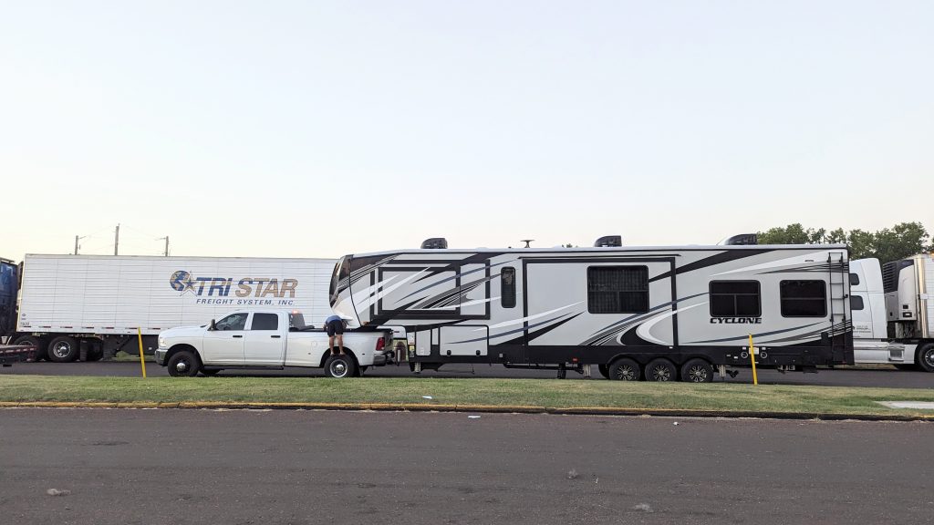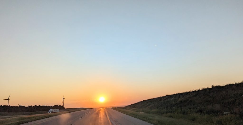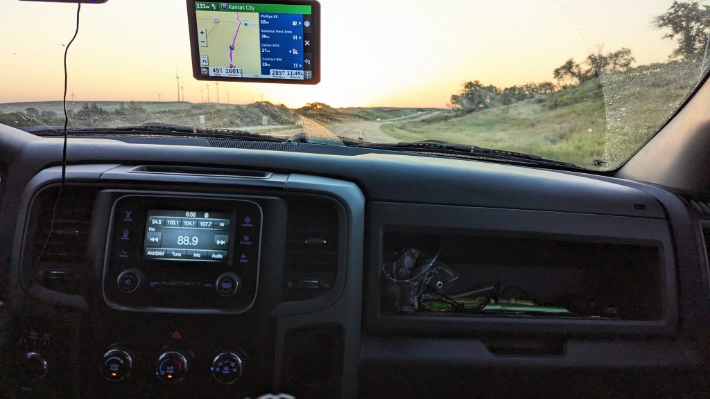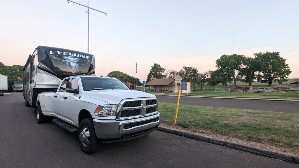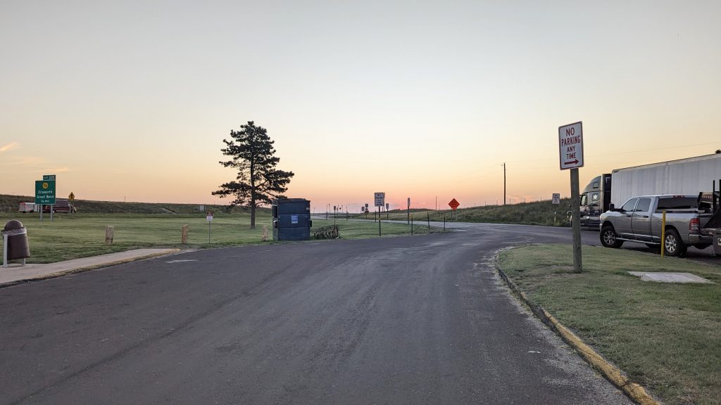 We needed to conquer about 700 miles to get closer to about halfway home. During research, we learned that Kansas rest areas allow you to stay for 24 hrs. You can even pitch a tent. So, we stayed overnight near Ellsworth, Kansas.